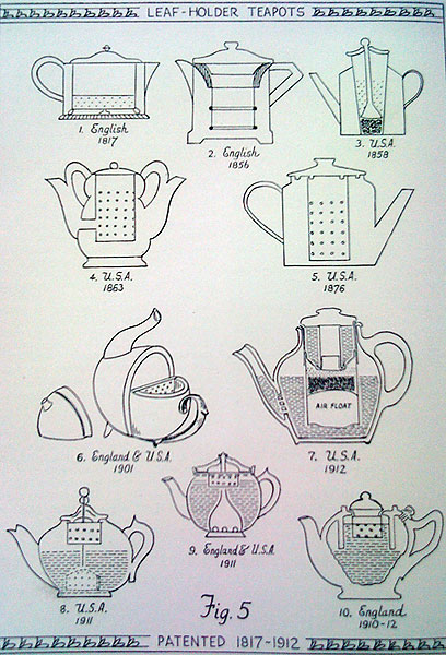 1. Ogle’s tea or coffee biggin. 2. Suspended strainer bag. 3. Leaf Squeezer. 4. Dual strength. 5. Removable leaf basket, attached to lid. 6. “S.Y.P.” tip-over pot. 7. The “London Tea Bob.” 8. Raisable leaf holder. 9. Air-valve leaf separator. 10. The “Anti-Tannic” air-valve tea infuser.